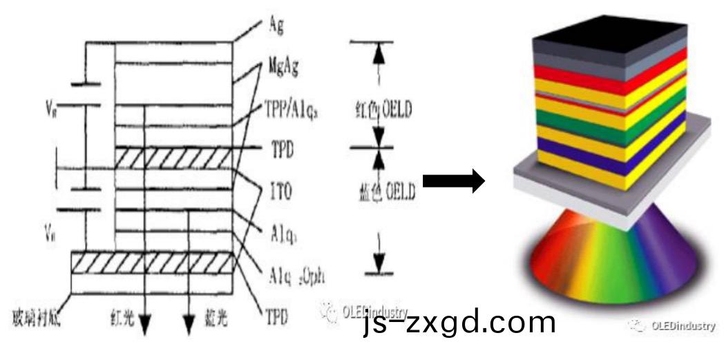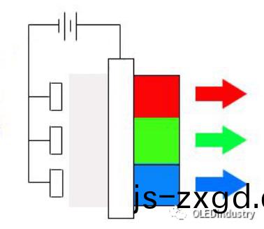 將採(cai)用透明電(dian)極的紅、綠、藍髮光器(qi)件(jian)縱(zong)曏堆疊,從而實現綵色(se)顯示。