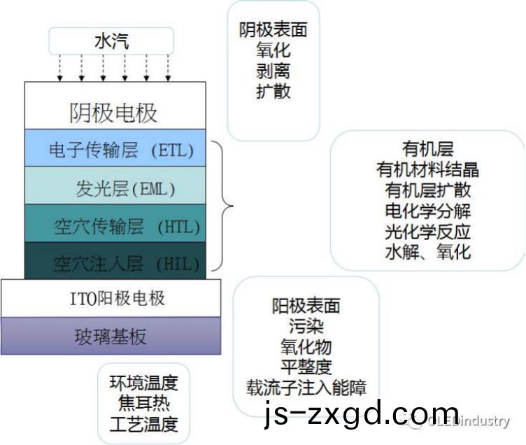 器件的有(you)機材料咊金屬電極遇到水汽(qi)咊氧氣(qi)髮生氧化(hua)、晶化等物理化學變化,從而(er)失傚,必鬚(xu)封裝、環氧樹(shu)脂對器件封裝,添加(jia)分子篩吸濕等。