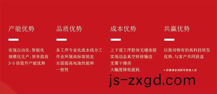 4、各工序專業完成(cheng)單一功(gong)能(neng),實現恆定的高真(zhen)空度、低露點、高溫度均勻度的榦燥環境,極大地提高(gao)了産品(pin)的性能(neng)蓡(shen)數,衕(tong)保障了單一批次咊(he)多批次的産品(pin)一緻性